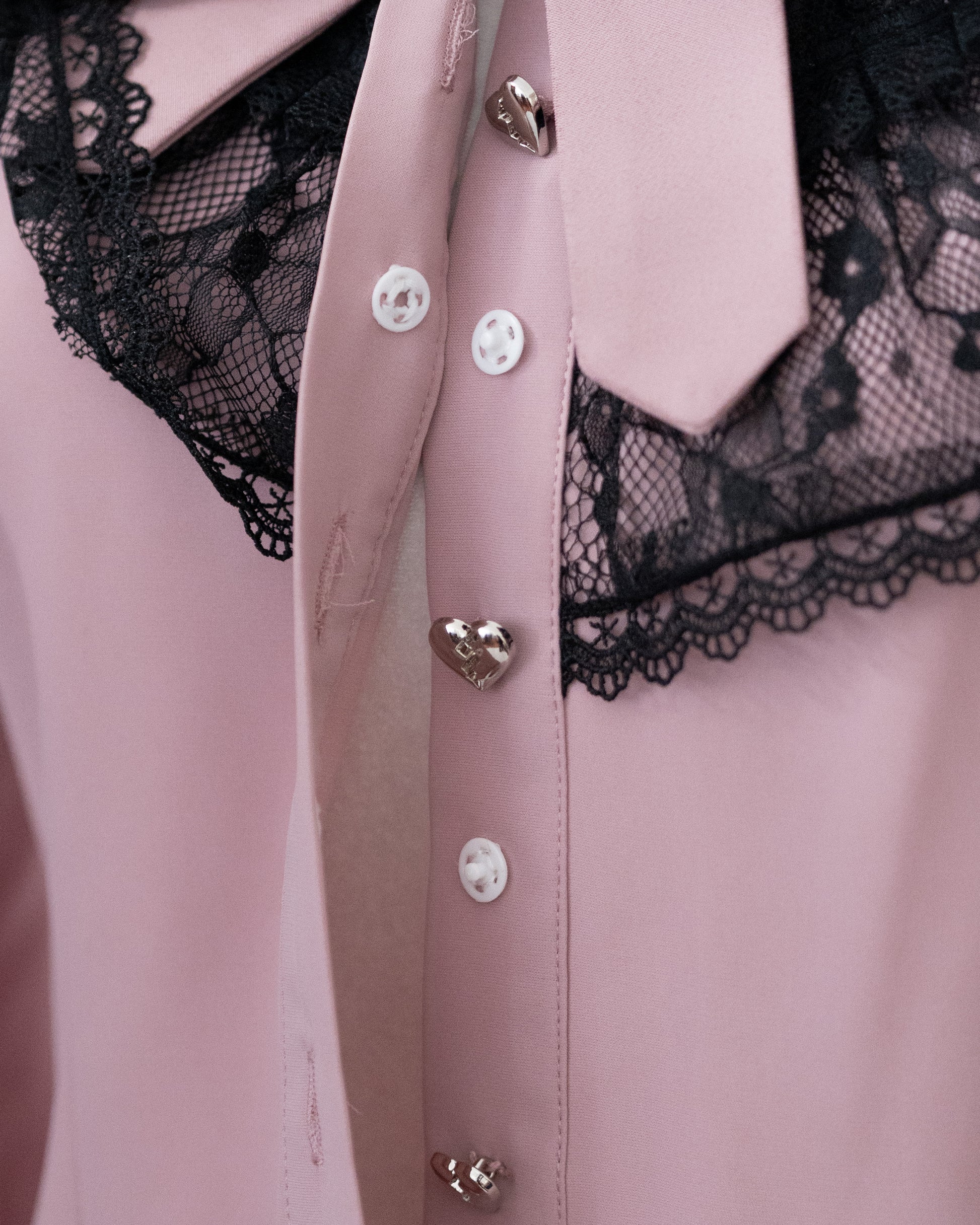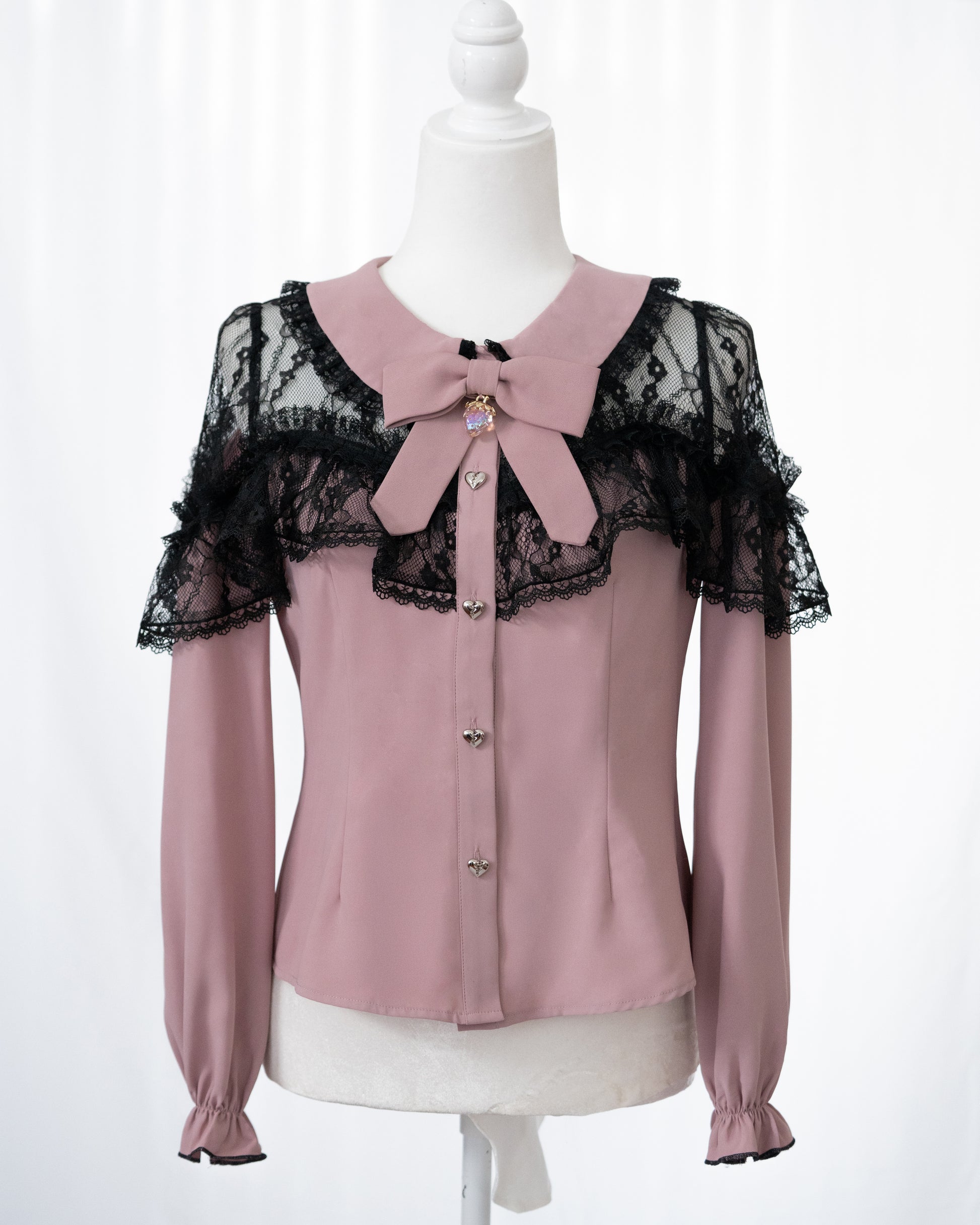 The lace collage on the shoulder with perfectly curved edges is the main point of this blouse. We used rounded necklines and rounded collar pieces to match the lace's cute, soft feel. 4 different types of laces are used here to give the piece more depth. The iridescent strawberry charm on the bow serves as the centerpiece. As always, 2 snap buttons are added on the chest area to prevent those awkward moments when wearing a button-up blouse!