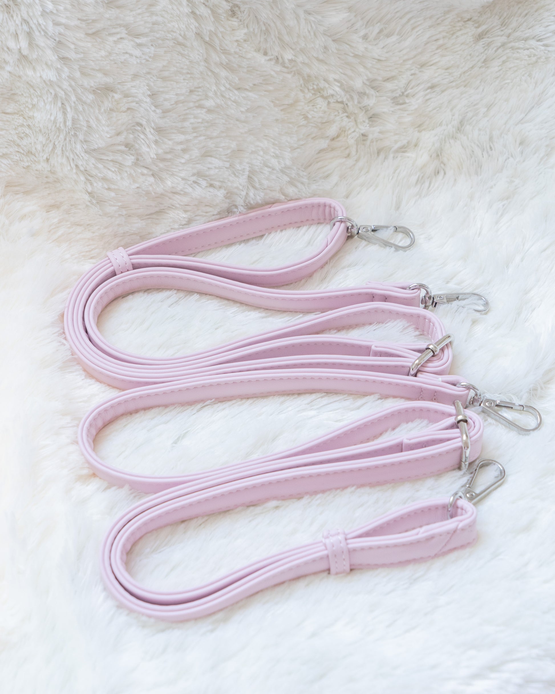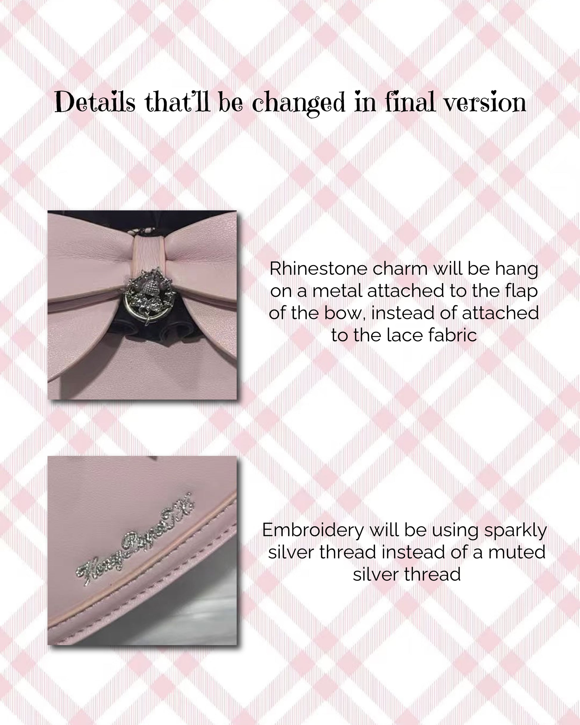 The “DokiCharm” heart bag features the classic pink+black color scheme. In the center, we collaged a delicate lace fabric, some black frills, and a pink bow. Under the bow, we put a heart rhinestone charm as the centerpiece of the design. To ensure this bag is as functional and versatile as possible, it will come with 2 adjustable leather straps and a silver purse chain. You can use it as a backpack, as a crossbody purse, a single shoulder bag, or a handbag.