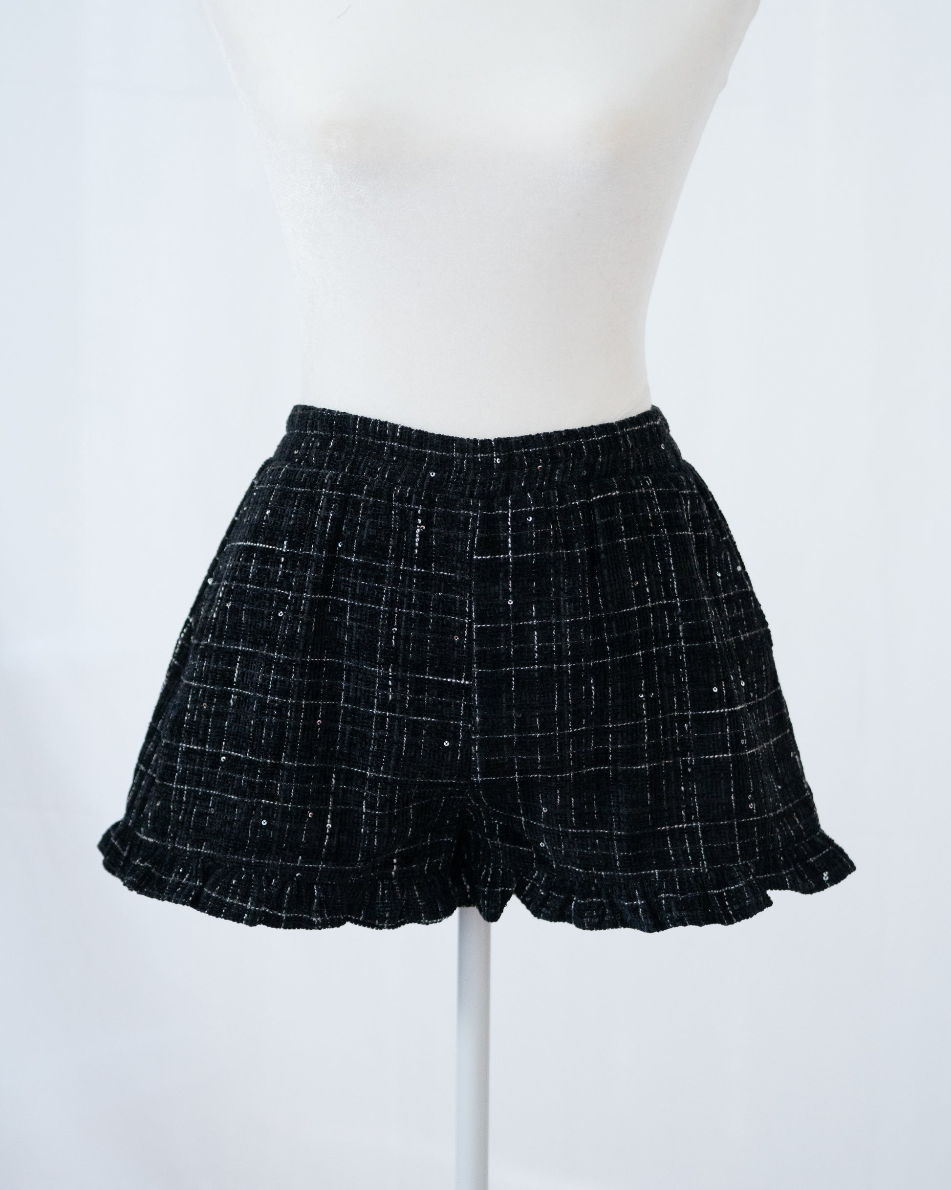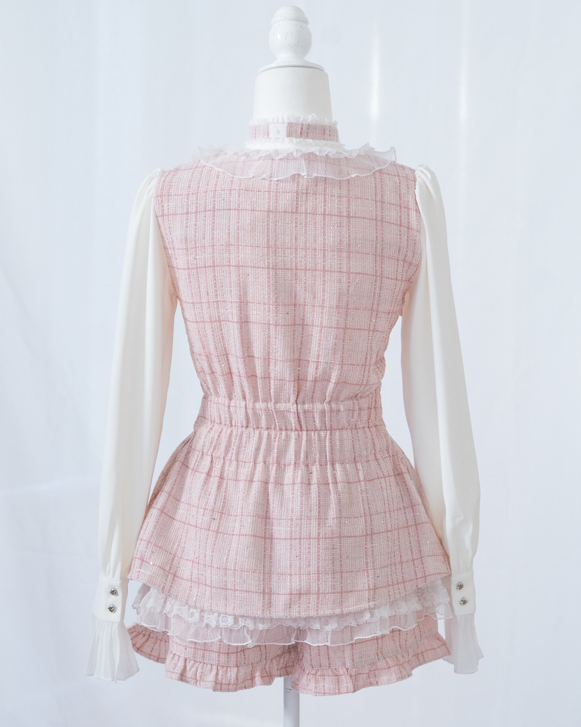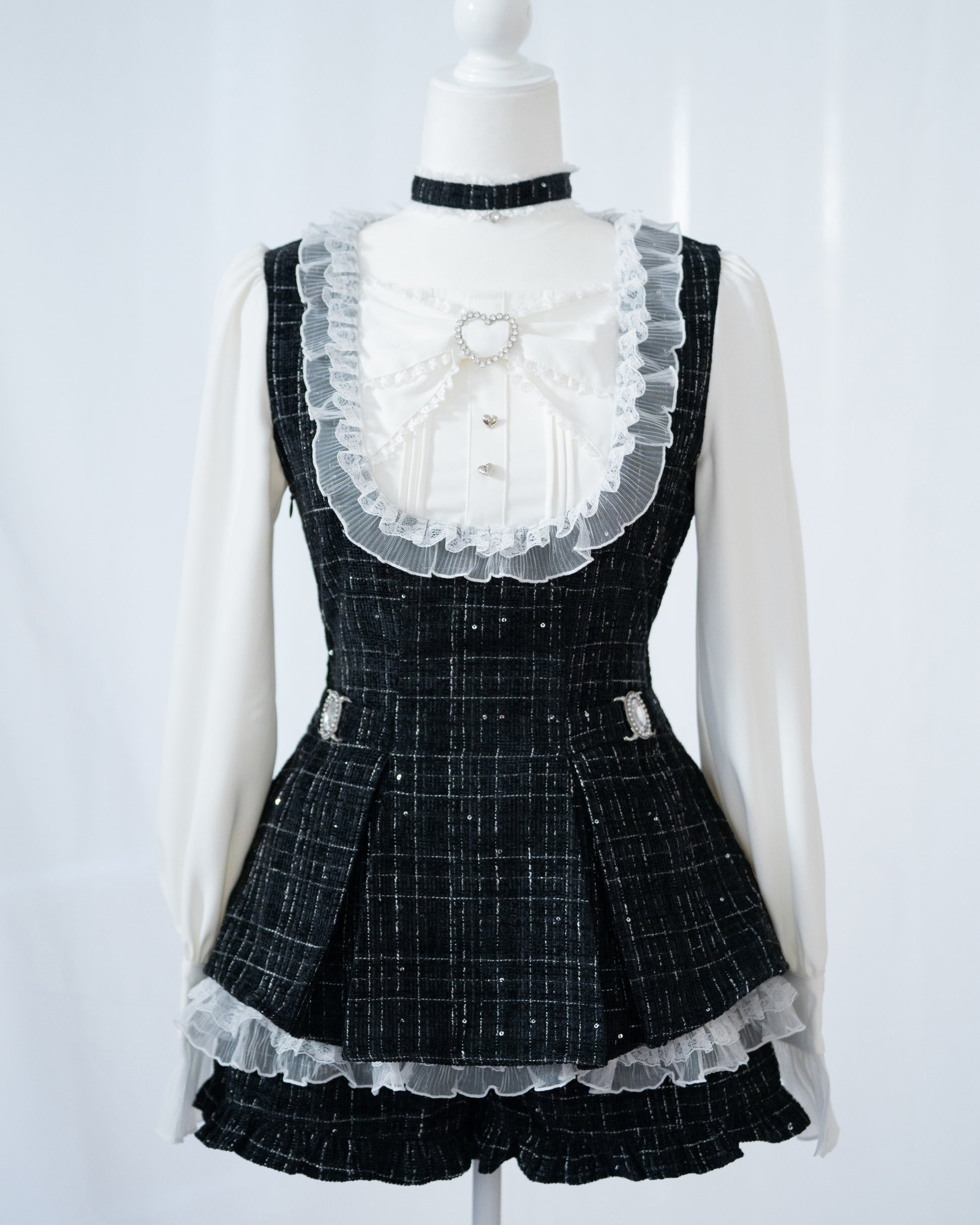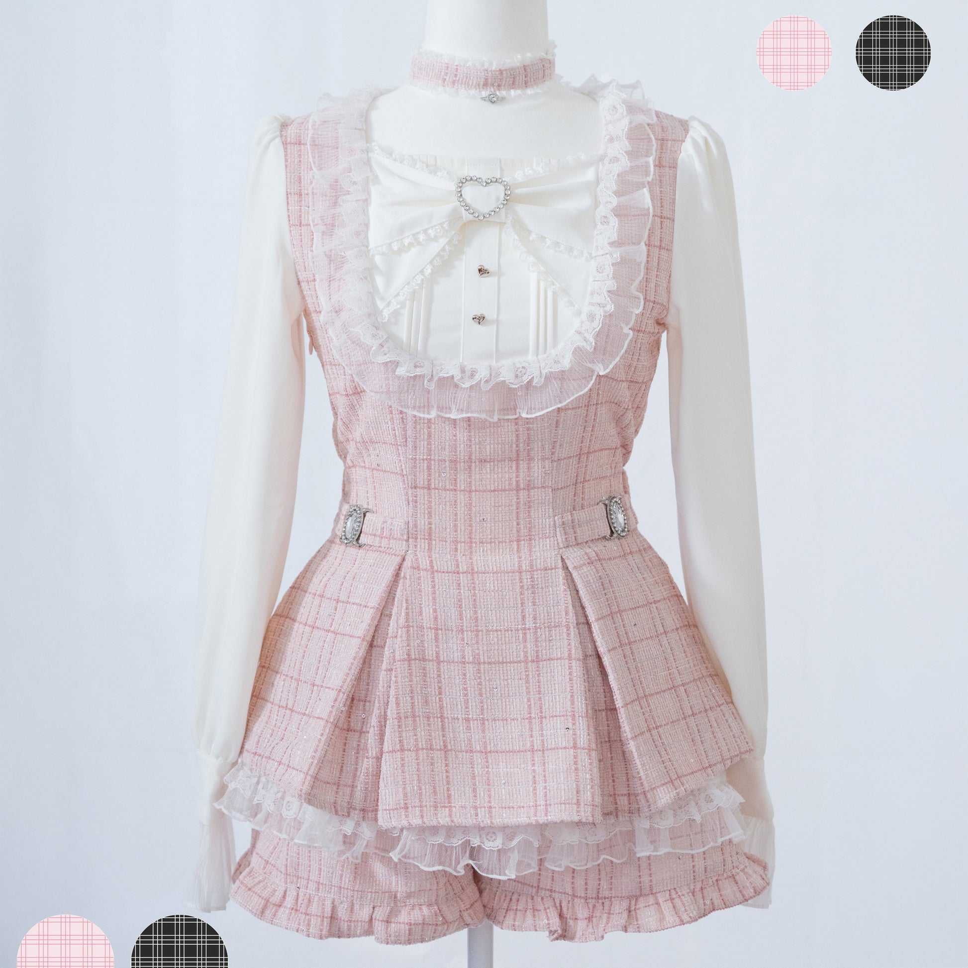 There are many charming points on this setup. Firstly, this is our first 3-piece setup. It will come with a matching tweed choker featuring a little winged heart rhinestone charm. It is also adjustable with the 3 snap buttons on the back. Secondly, the neckline and chest design is the centerpiece of this setup. The bow-shaped frills feature a rhinestone heart in the center, complemented by the double-layered lace around it. And lastly, to keep this design functional, we added pockets on both sides of both the tops and the shorts, so 4 pockets in total!